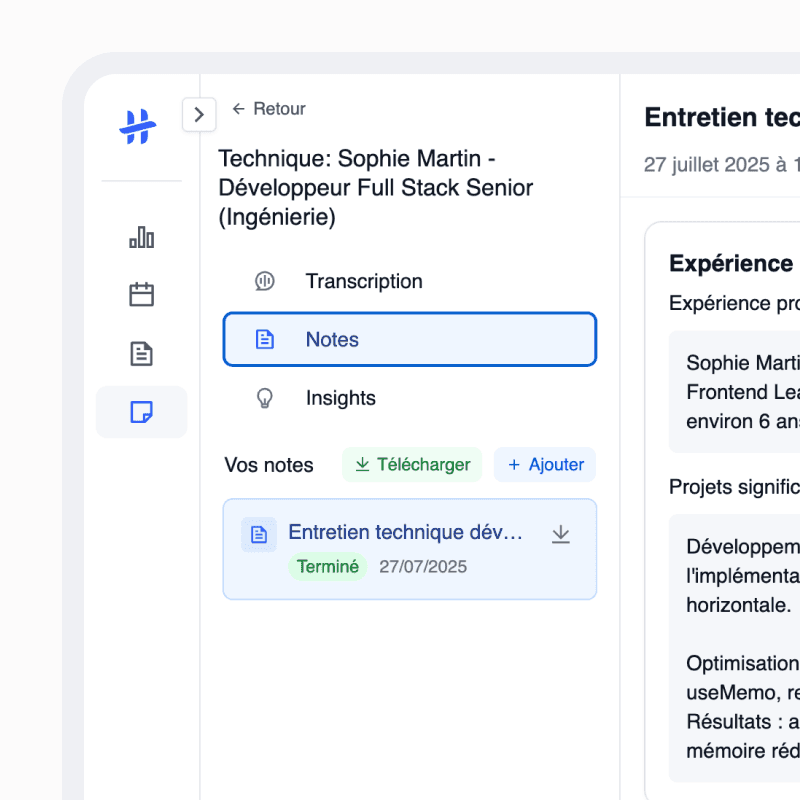 Transformez vos entretiens en insights actionnables avec notre IA spécialisée RH. Plus de prise de notes manuelle, juste des synthèses précises et exploitables.